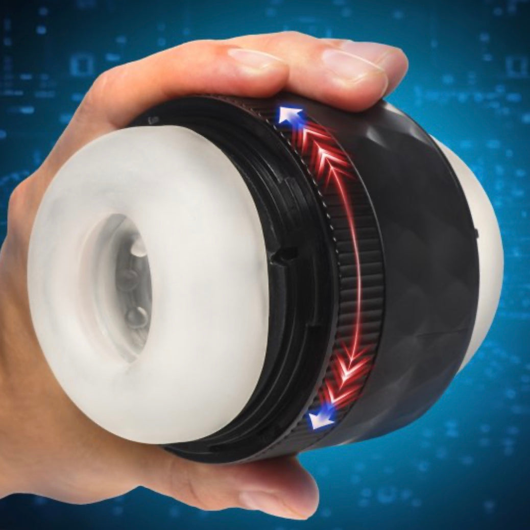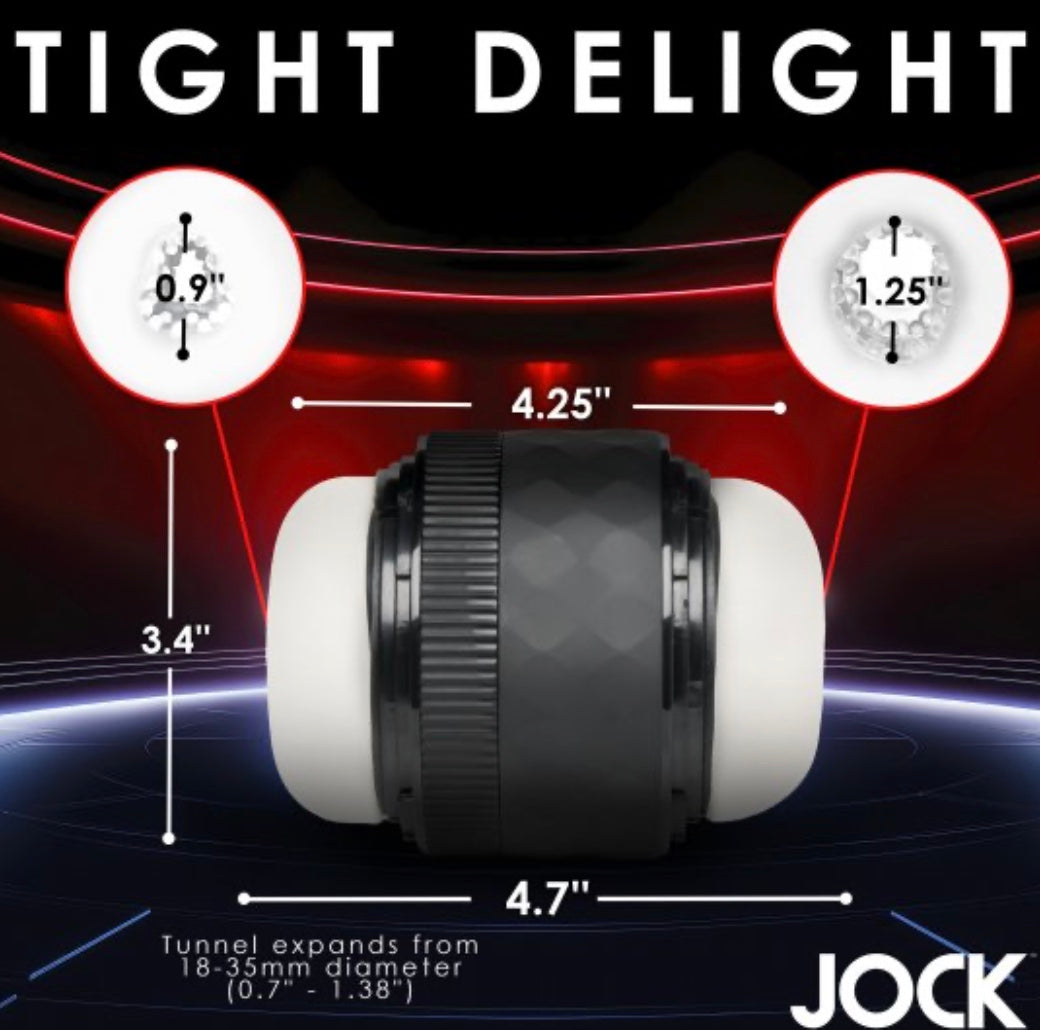 Customize your fit with this tightening masturbator! This stretchy, soft, TPE tunnel sits inside of a plastic case and can be adjusted to get smaller or larger for your shaft size and preference. Choose between 6 different tightness settings by turning the ring around the case to larger or smaller. Inside the tunnel are textured nubs that add to the sensation! Enjoy using it with the cap on one side or take it off for a cum-thru tip! Each side has a slightly different-sized hole, so you can choose which side you'd like to enter depending on how tight of a squeeze you want! Clean it up by rinsing it out and using mild soap and warm water, then letting it air-dry. Put both caps back on to keep dust and debris out. The case also provides a good grip so you can hold on easily as you stroke yourself with lots of lube! Only use water-based or silicone lubricants for best results.